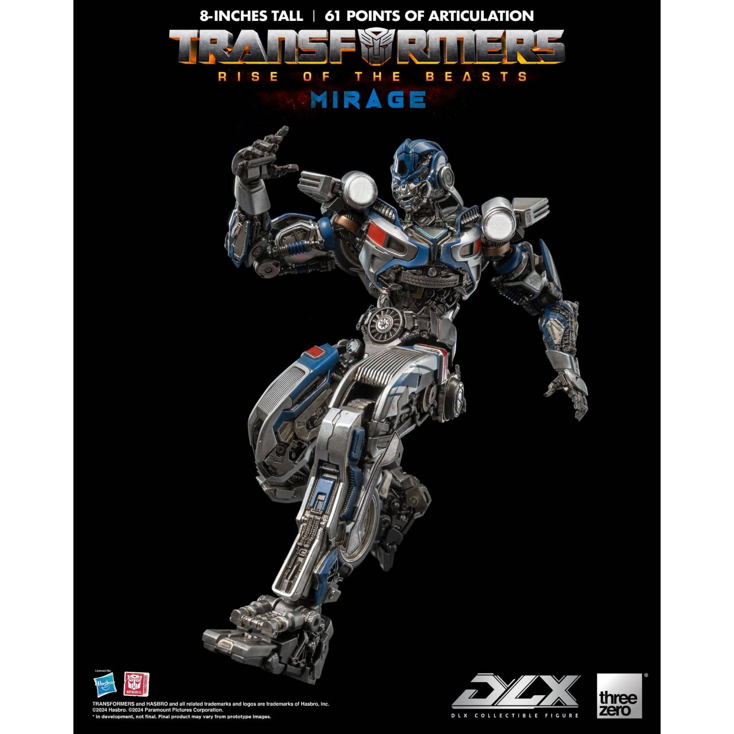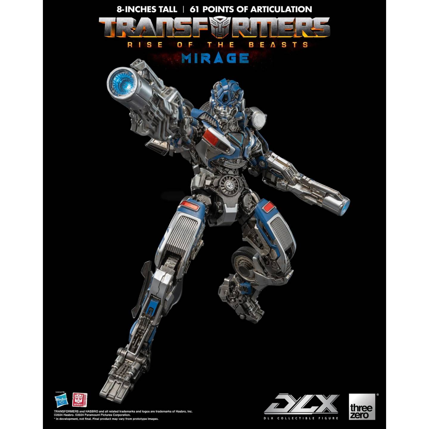 This Transformers figure represents the Mirage Autobot as he appears in the film. Made from high-quality plastic and die-cast metal, it features 61 points of articulation. This is Threezeo's first DLX figure to feature LED lights in the eyes, ion blaster, chest and shoulders. A control panel bearing the Autobot logo controls the lighting effects.