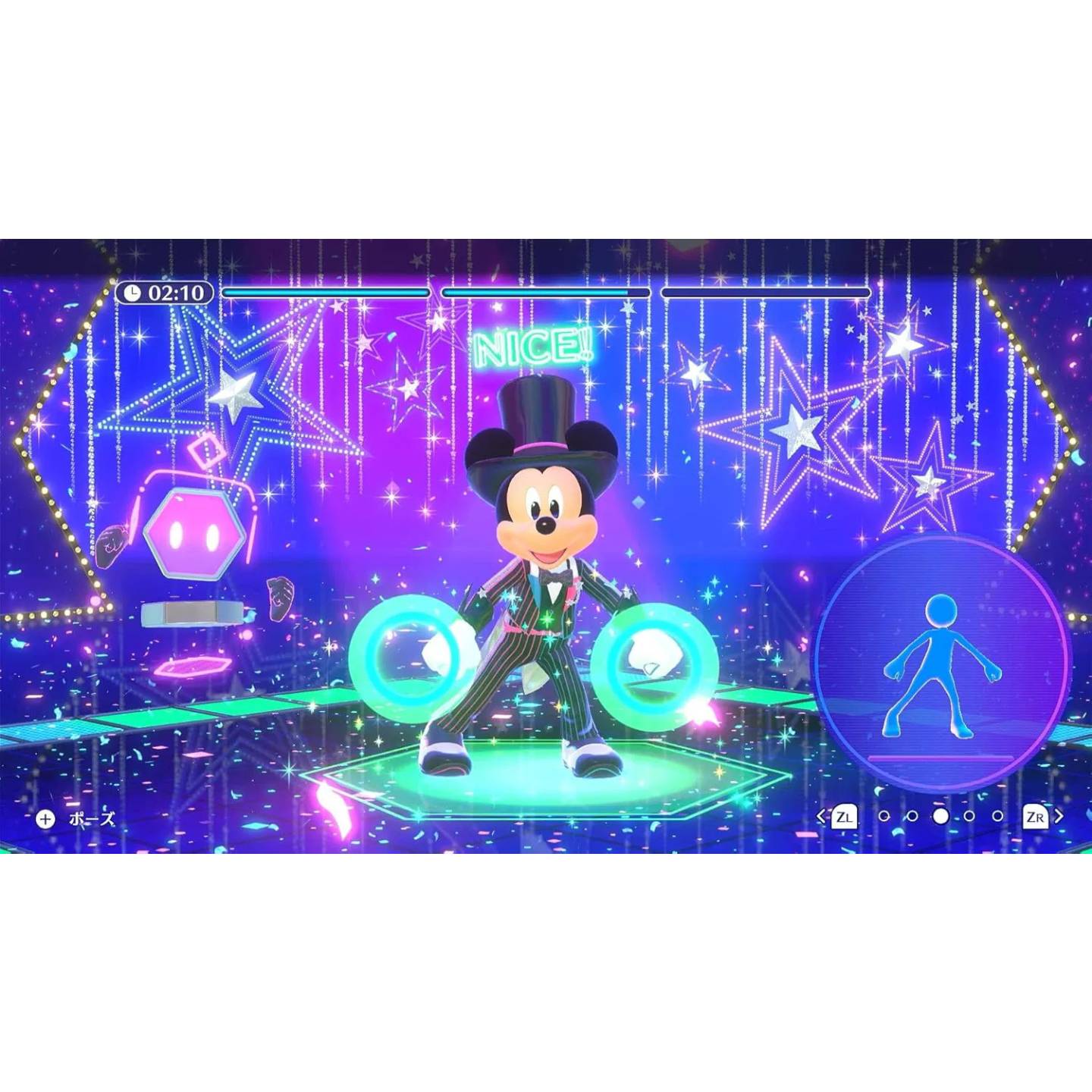 Hold the Joy-Con in both hands and move like Mickey! Your assistant Hexie will support your workout routine!